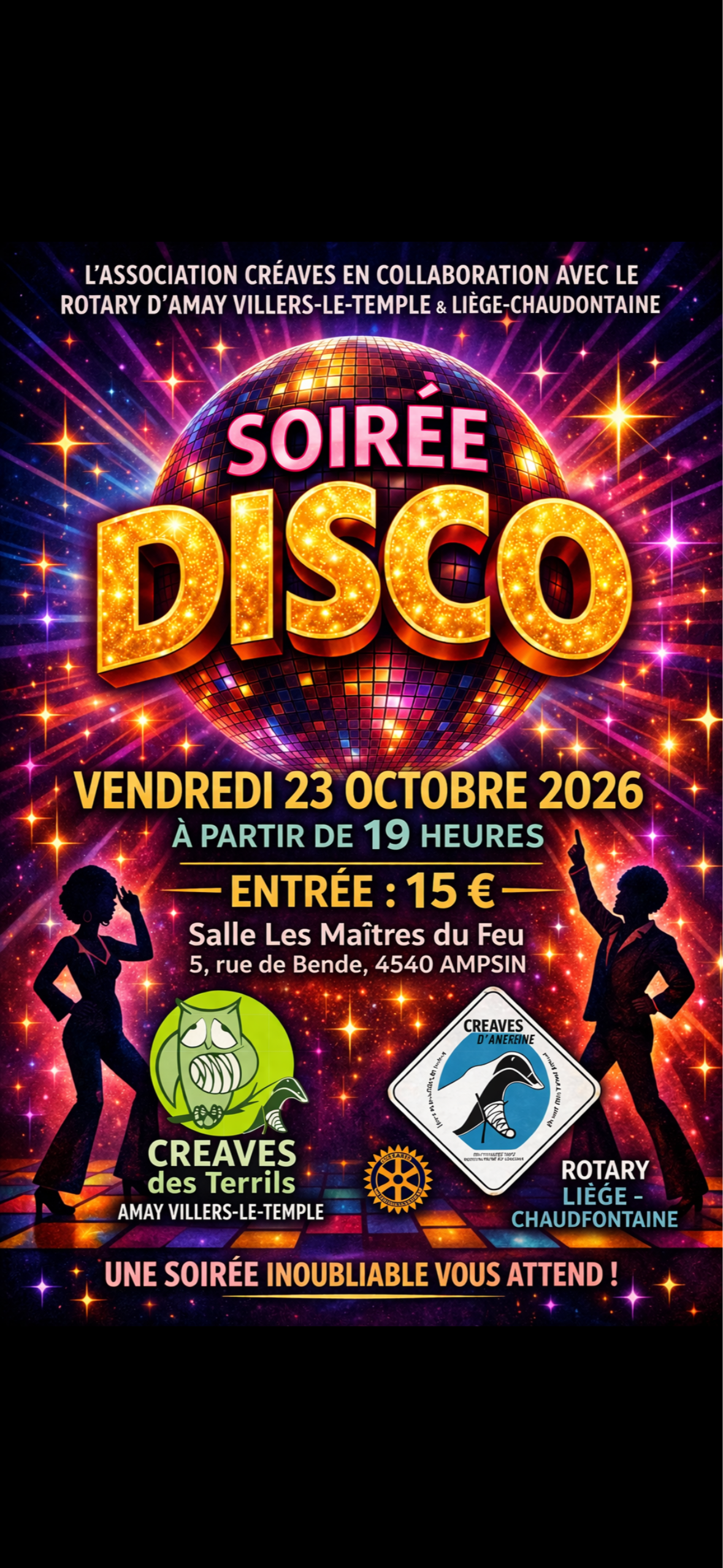 Bloquez dès à présent votre agenda pour nous rejoindre lors de notre Soirée DISCO, organisée conjointement avec le Rotary club de Liège-Chaudfontaine.